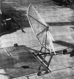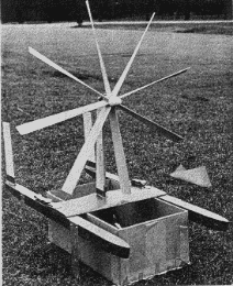 First, in 1960, there was William Garnett, who had a little model on wheels which drove the front wheel. It had eight sails, slightly coned, with the hub to windward of the mast but the centre of sail area to leeward. It was also raked to leeward, to provide lateral balance. It went forwards in any wind direction, but unfortunately it did not go as fast as a normal sail. On the other hand, it did stay up in winds where normal sails fell over, so the model could actually have taken a larger wind turbine for the same stability.