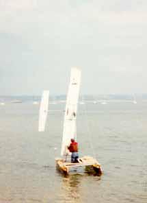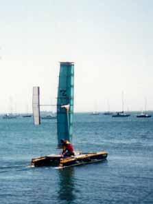 The sail is called "Skean-Dhu" (Patent No 9109807.9), and it controls an asymmetric underwater hydrofoil, to counteract the side force.