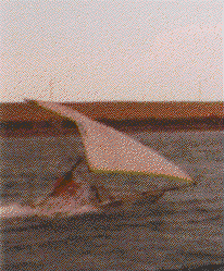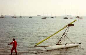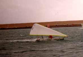 Jean says that it will only sail properly in a 30 kt wind, when the lift on the inclined sail should be equal to the weight, and the boat should fly.