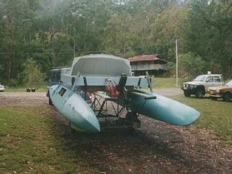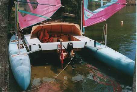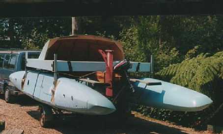 Photo 2 shows Windriggercat MK II rigged for trailering. Note the hulls are fixed in the trailering position.