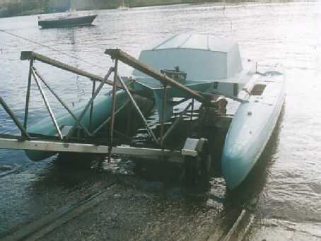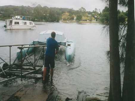 Photo 4 - note that the sterns of the cat are in contact wth the water causing the hulls to move outwards as it cat moves down the trailer-rails