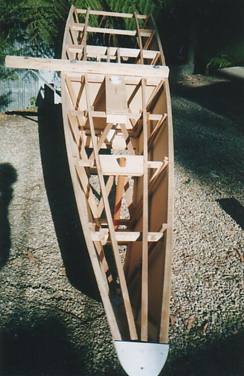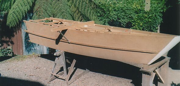 The following covers a description of this boatbuilding method and a half-length hull I constructed to illustrate the method and prove my ideas and calculations. This hull was made from cheap non-water-proof materials to facilitate tryout of various boatbuilding techniques, framing schemes and aesthetic features of the hull. I labelled it - the Tryout hull.