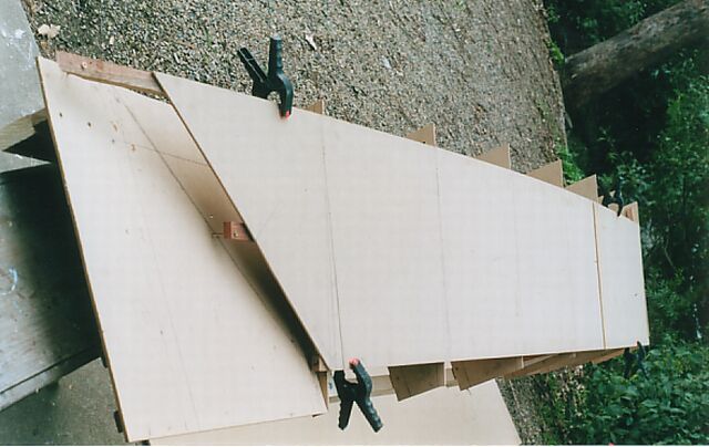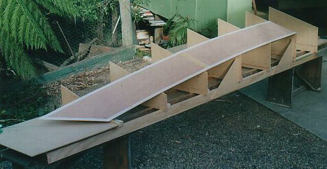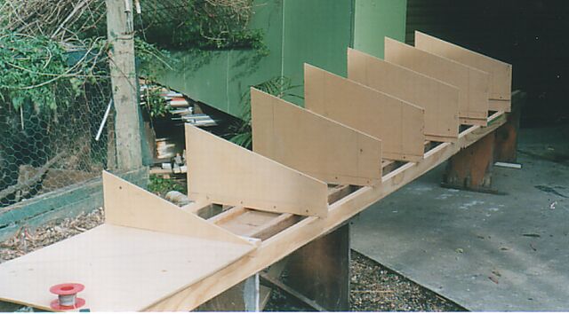 The sheer line and rocker are the result of the parallel fore-and-aft edges of the side panels - producing an 80mm rise at the bow. Parallel was selected to simplify cutting out the side panels and fortunately it looks o.k. To obtain a particular rocker and or sheer line, the associated vertical offsets are marked out on the jig cross-sections and transferred to its associated side panel.