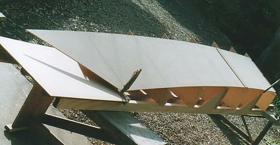 Photo 2 - marking the chine and sheer-line intersection points on the jig sections. (The transverse strap shown on the hull surface covers a but-joint instead on a scarf-joint which would be used for a real hull)
