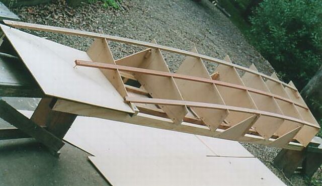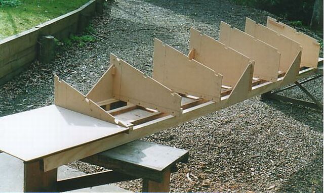 The description is based on a half-length hull jig which was used solely to facilitate tryout and development of the building method. In practice a full-length jig would be used to build the two sides of a hull.