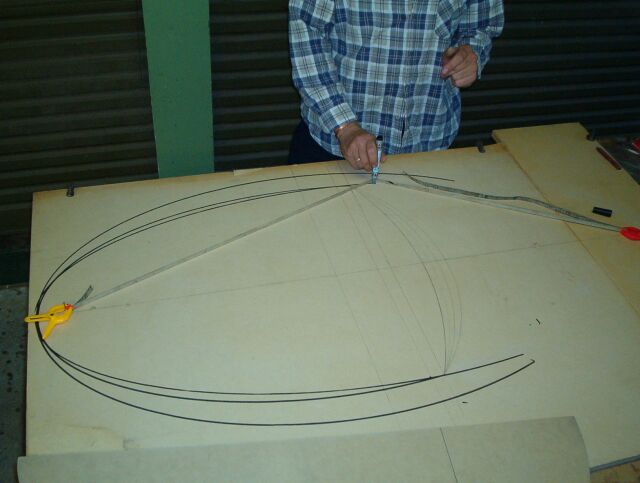 This elliptical section was selected from a number of ellipses drawn full size as shown in Photo 1, which also shows an easy way to draw an ellipse. Pertinent features of the ellipse - it has a major and a minor axis with their centrepoints forming a right-angle cross at what is known as the centrepoint of the ellipse. It has two foci points which lie on the major axis equidistant from the centrepoint. The distance of a foci from the centrepoint is calculated by the square root of the (major axis squared minus the minor axis squared). The ellipse is drawn using a string of length equal to that of the major axis, with each end fastened to a foci point and stretched tight by a pencil at the apex formed by the string - as in Photo 1. ( in the photo I used a length of fibreglass measuring tape because, unlike string it does not stretch). I selected the inner-most ellipse of the three shown on Photo1 as the midship section for this cat design - labelled EllipseXcat. It has a major axis of 700mm, minor axis of 300mm and foci points 632mm from the ellipse centrepoint. I produced a template of this curve as shown below on the left-hand side of Photo 2.