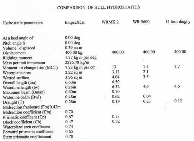 Photo 4 - Hydrostatic data of EllipseXcat and other craft, produced with HULLFORM