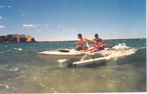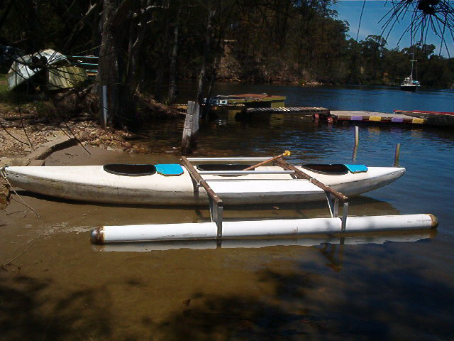 The more I learnt about this white-water the more it began to frightened me - particularly the force of the fast-flowing water, stopper waves and the lethal submerged tree-roots below beautiful willows along the river banks. So after 4 years of canoeing, I added an outrigger to the Platypus - as shown in photo 3, and used this proa for touring the sea coast and as a spearfishing platform. Its tubular outrigger does not produce any noticeable drag and resistance to movement of the sea - the reason why I favour tubular outriggers for my proas and trimarans.