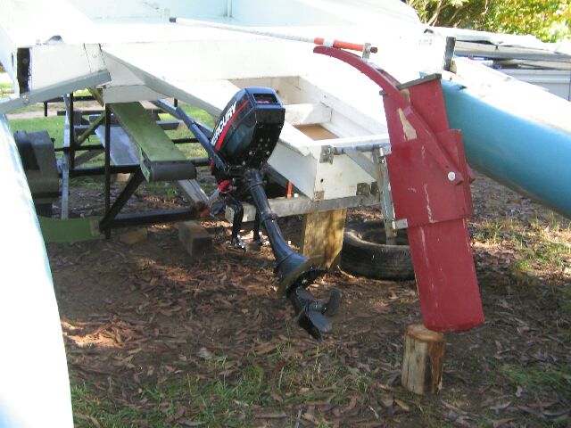 When passing from a beach out through surf under sail - some centreboard and rudder in the water are essential to make way through the waves. These requirements are achieveable with the centreboard and rudder systems shown in photo 1 of the Dec 2004 installment and photo 6 below.