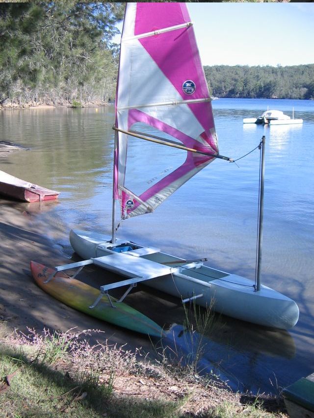 Referring to Photo 1, The outrigger is a wave-sailboard hull and the structure attaching it to the crossbeams is a quickfix which facilitates changing the board's planning angle and transverse tilt. Notable outcomes of the trials were - the proa was more manageable on the tack with the sailboard to leeward and it appeared to develop adequate lateral resistance - showing good potential for a trimaran using two sailboards thus negating the need for centreboard/fins. On the other tack the proa produced large weather-helm caused I guess by the centreplate positioned to far forward; and the steering oar was found to be very ungainly. Add to this scene, the threat of capsizing the proa in the unpredictable winds of the river and it is not surprising that these trials were non-productive. So I have mounted an outboard on the proa and aim to concentrate first on developing a functional rudder/steering paddle using outboard-motor power instead of sail-power. I favour the steering oar/paddle because it can be used to row the catamaran to assist tacking - and provide a means of propulsion when the outboard motor fails.