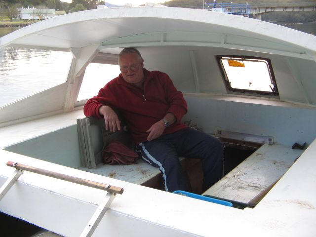 Photo 4 - My mate John sitting in the cabin with his feet resting comfortably on the centrehull floor.