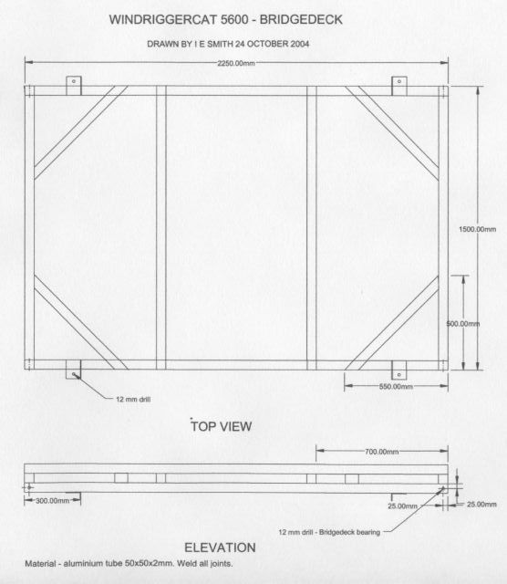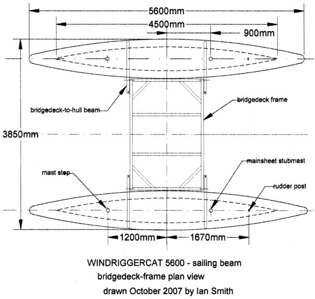 The bridgedeck was constructed to carry the twisting loads generated by the angular-displacement of the catamaran hulls working in a seaway, and consequently minimise torsion stresses on the hulls. This torsionally-stiff bridgedeck was constructed according to drawing below. During 5 years sailing this catamaran, it never displayed noticeable angular deflection of the hulls. Lifting up the bow of one hull caused the other hull to lift producing not more than 50 mm difference in vertical displace of the two bows. So I concluded the bridgedeck construction fulfilled this design objective.