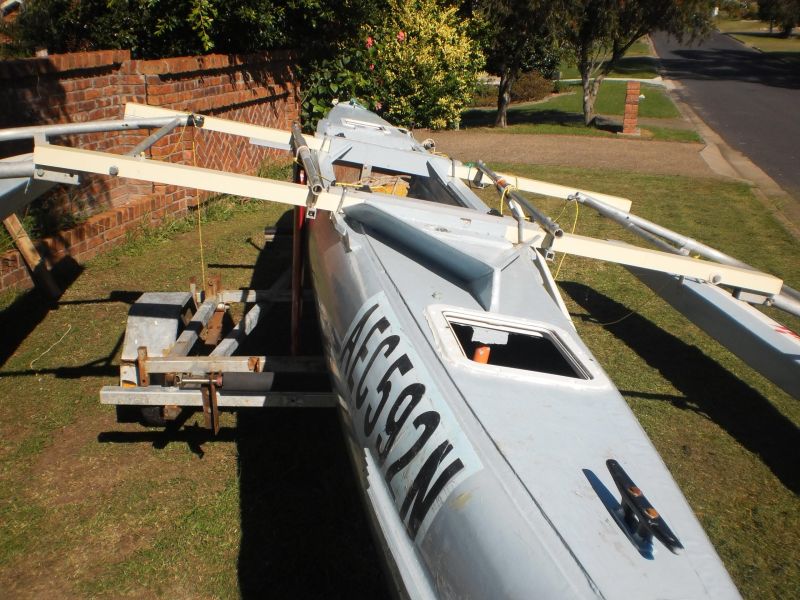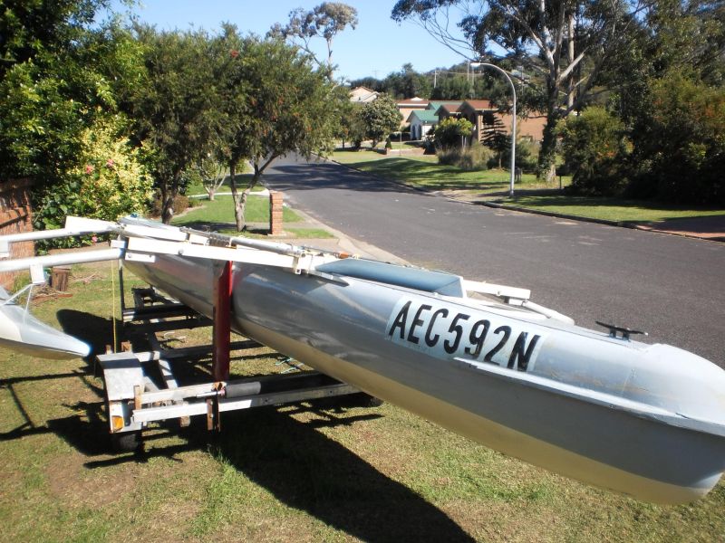 Photo 3 - Note crossbeams of 60mm dia. 3mm thick aluminium tube mounted through the hull just below the deck and fastened to the hull with U-bolts. It is rigged as a proa with the Dory outrigger - for its first trial.