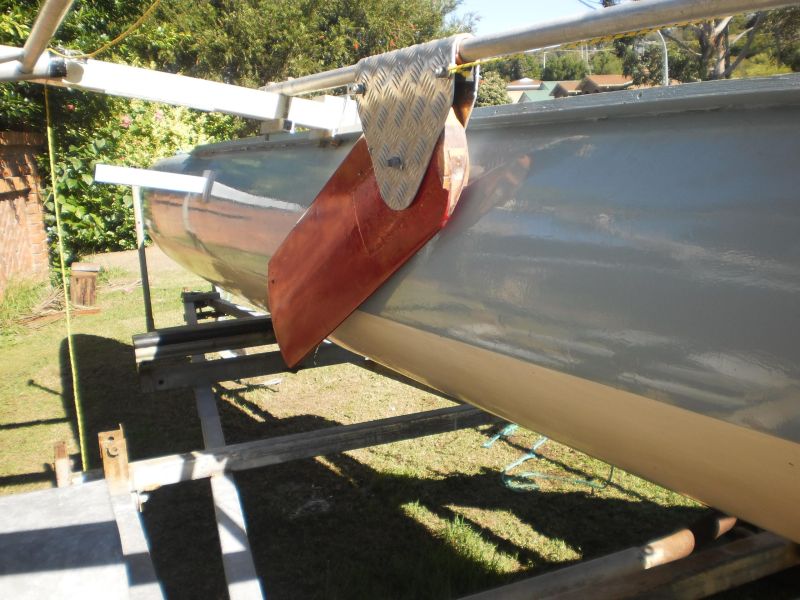 Photo 14 - The red leeboard set in the down position. When sailing to windward the leeward leeboard presses against the side of the hull by a hydrodynamic force produced by water flow across the leeboard which angled around 5 degrees to the hull fore and aft centreline. The windward leeboard moves away from its associated hull topside - and we lift it up as shown in photo 16 to reduce drag.