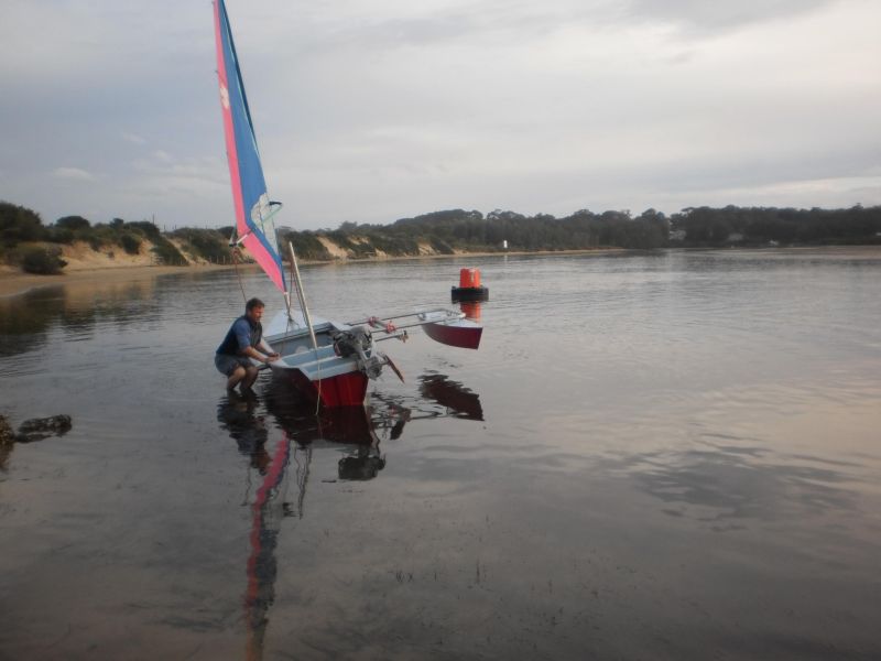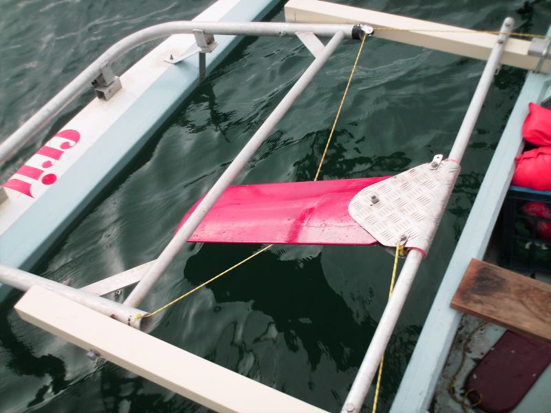 Photo 17 - Note the two leeboards - red one starboard side and white the port side. Maybe these leeboards can be used as lifting foils by shifting the two leeboard-supporting tubes outboard about 500mm.