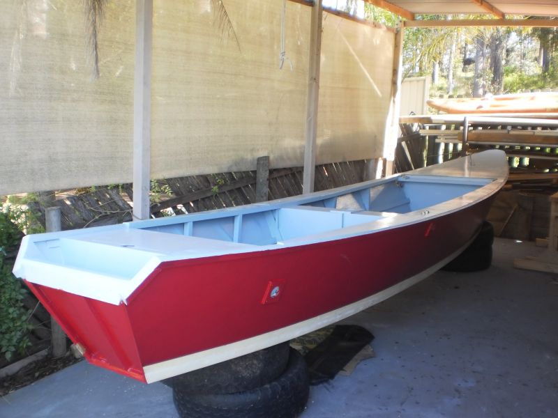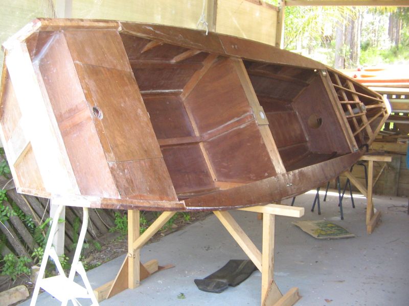 Photo 1 - Topside material 4.5mm ply skinned with 6 oz fibreglass cloth. Its flat bottom is 12mm ply painted on the bottom with epoxy flowcoat to reduce abrasion when sliding it over beach surface. The chines were screw-fastened, glued and fibreglassed.
