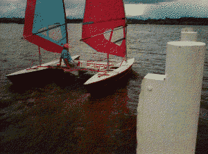 As stated below, those who have never sailed before have enjoyed their sail on Windriggercat. The main reasons for this are: comfortable centre-cockpit accomodation, sails that can jibe without hitting the passengers, dual rudder-tillers so that a learner can sit in one hull and steer whilst I sit in the other hull controlling both sails and with quick access to the other tiller.