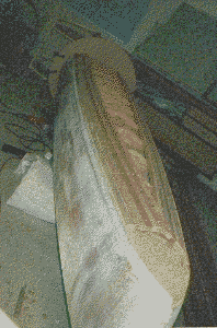 Photo 5 shows strip-planking the deck of the plug. Note that the lower part of the hull has been filled and sanded and noseblock added. Prior to this the strips were faired and covered with one layer of fibreglass/epoxy cloth to arrest shrinkage of the timber. I have included the plug photos to show that this hull could be striplanked in stead of fibreglassed. I could supply the fibreglassed noseblocks which would simplify this process.