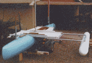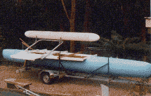 12 - Rigged for trailering. Note the end caps on the tubular outrigger. These are epoxy/fibreglass mouldings - it took me 2 months to make its plug and fibreglass mould.