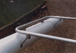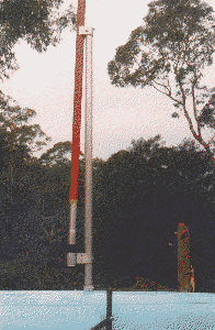 8 - Details of the stubmast arrangement for supporting the sailboard rigs as shown in photo 1. Photo 8 shows the sailboard mast, mast bottom socket and upper quickclip fittings, developed to support most types of sailboard sailrigs. This arrangement provides access for experimentation, to a very large number of sailboard sails which are superior to yacht sails and much cheaper. Previously I used a stubmast located inside the sail luff-sock with the lower-end of the sailboard mast supported inside it - like a Laser mast. Although this is aerodynamically superior only a few sailboard sails have luff-socks big enough to accommodate the required 60 mm diameter stub mast and this relatively-stiff stubmast does not bend to match the cut of sailboard sail and thus spoils the shape of the sail.