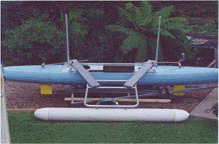 Photograph 1 shows the trailering position of MK 3 - developed to overcome the launching problem. The proa is launched in this configuration, the sailrigs installed and then the outrigger is moved out to its sailing position.