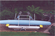 This allows the proa to be launched and beached onshore with its spade-rudders rigged for sailing. Not shown is a removable strut used to tie together the hull and outrigger in the trailering position.